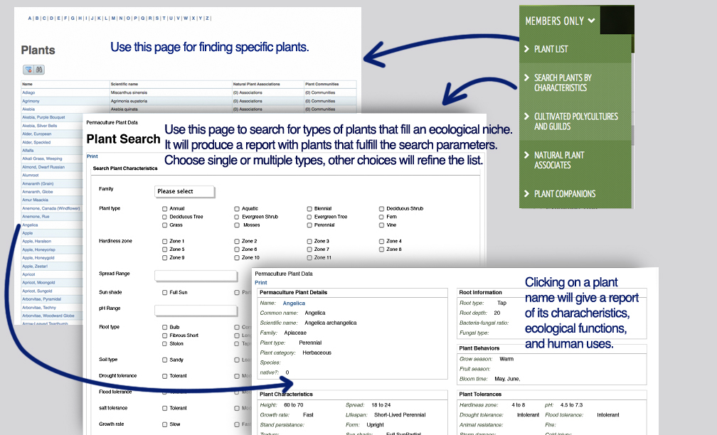 Start here if you are interested in learning about an individual plant: its niche, its allies (pollinators, dispersers, and soil organisms), its natural associates and its cultivated polycultures and guilds. You can enter a partial plant name or scientific name to begin the search.